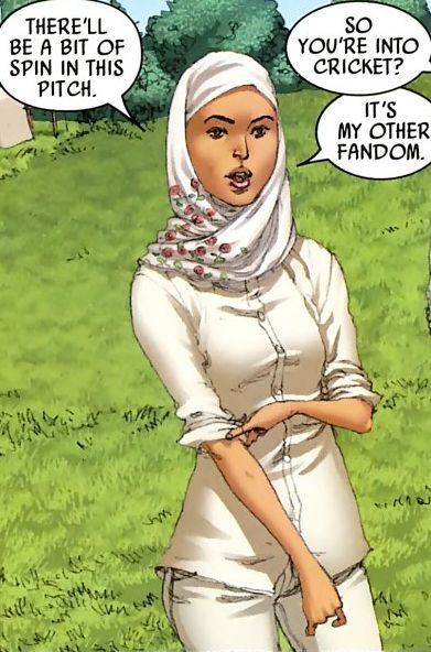 In one picture, Faiza rolls up her sleeves during a cricket game, and in another, she rides with Black Knight Dane Whitman on horseback. If memory serves, she even took Dane or Capt. Britain himself to meet her parents, which is unrealistic since in real life, for a Muslim woman to have anything perceived as an affair with an "infidel" (non-Muslim), could easily result in violent reactions from the father (as in the case of an actress in the Harry Potter films), and there've been many Muslim women who fell victim to honor murders committed by relatives who refuse to recognize a woman's right to free choice. Similarly, even rolling up her sleeves could be considered haram (taboo) among hardcore Islamisogynists.